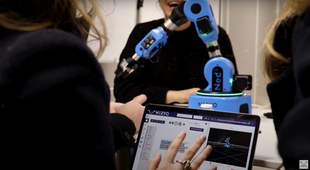 Bei Niryo haben wir uns für beides entschieden! Unabhängig von Ihren Programmierkenntnissen oder Ihrem technischen Niveau können Sie entweder Ihren Roboter mit Python programmieren und die Wurzeln des Programmierens entdecken, oder Sie können einfach auf unsere Plattform zugreifen: Niryo Studio, basierend auf Blockly. Auf diese Weise, können Sie ganz einfach Blöcke zu Ihrem Blockly Interface hinzufügen und es mit Ihrem Roboter verbindenund so Ihren Roboter ohne jegliche Programmierung programmieren.
