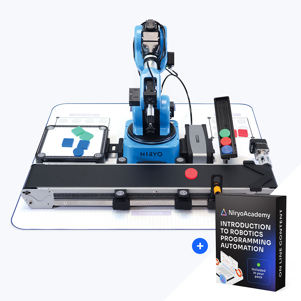 Das Paket besteht aus dem Discovery Bundle und exklusiven Inhalten, die auf NiryoAcademy verfügbar sind. Entdecken Sie die Welt der Robotik mit unserem umfassenden Programm, das sich an Schüler und Lehrer richtet, die die Grundlagen der Automatisierung, Programmierung und Roboteranwendungen erforschen möchten. Dieser Kurs führt die Lernenden von den Grundlagen der Geschichte der Robotik bis hin zur praktischen Programmierung und industriellen Automatisierung mit dem kollaborativen Roboter NED2 (Cobot) und der Blockly-Programmierung.