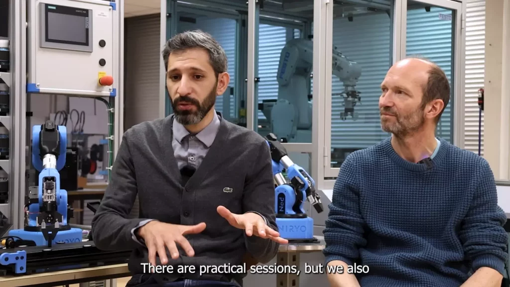 Othman Lakhal, Maître de Conférences à Polytech Lille et Enseignant au sein du Master Ingénierie des Systèmes Embarqués (ES), nous explique que l’utilisation des bras robotisés Niryo permet aux étudiants de première année d’accéder à un apprentissage pratique.